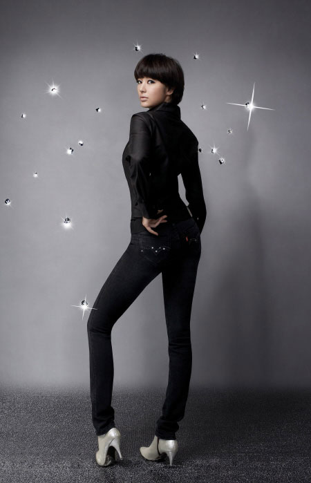 韩国女演员尹恩惠成为世界某著名牛仔裤品牌形象代言人,在为该品牌拍摄的平面广告中展示了完美的女性身材曲线。