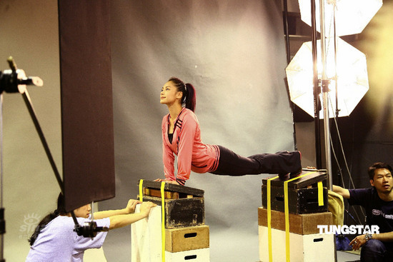 为突显女性运动时的体态美,阿娇化身“蛇美人”,并身穿最新2007秋冬女装Yoga系列服装,保持“拗腰”姿势逾两小时,让拍摄队伍在现场一边拍摄一边检讨效果。虽然拍摄完毕后腰部十分酸软,幸好体贴的工作人员们即时替她按摩舒缓,加上众人对照片的效果也感到满意。纵使辛苦,阿娇也感到值得的。