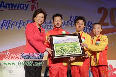 安利中国董事长郑李锦芬向代言纽崔莱的中国男女体操队赠送礼品
